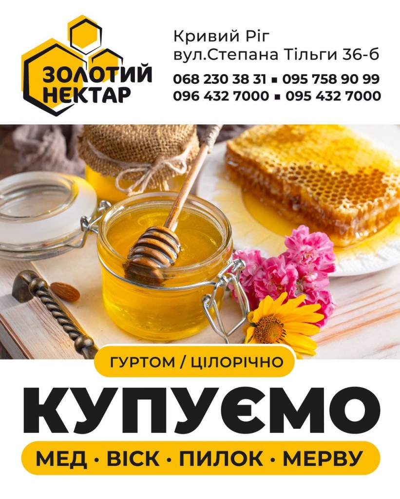 Компанія «Золотий нектар» закуповує мед Липи, Гречки, Акації та Різнотрав’я від 300 кг без антибіотика. Розрахунок відразу 100%. Доставка нашим ...